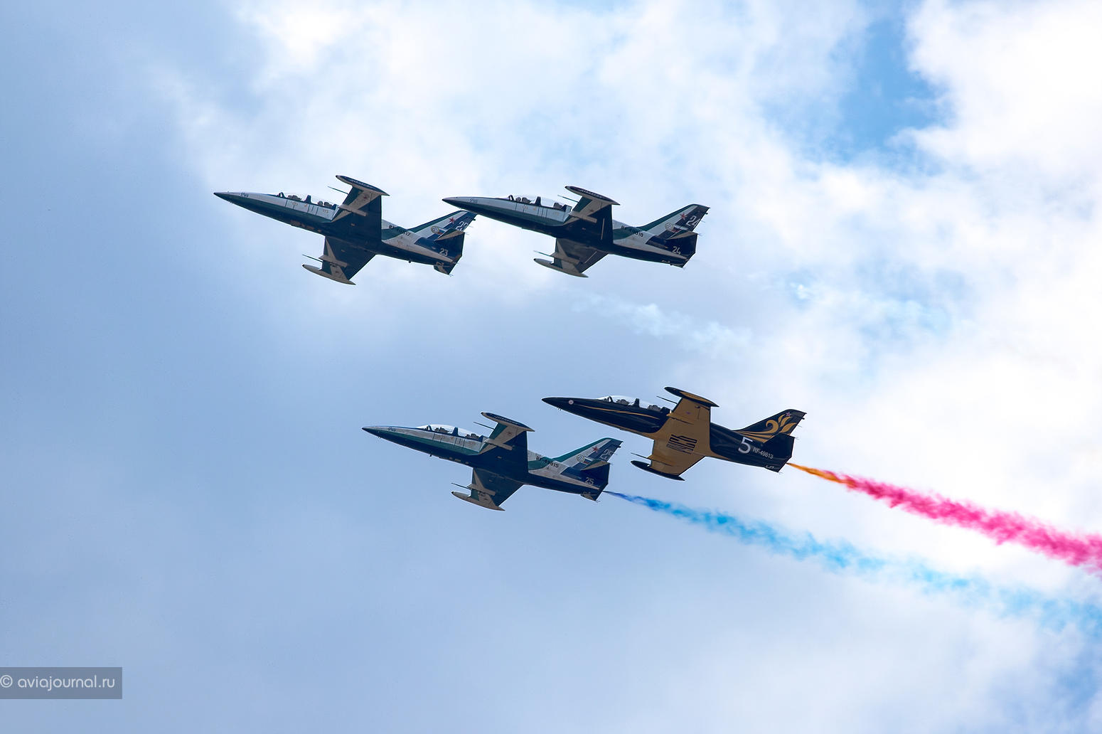 Несколько слов о пилотажной группе «Белые альбатросы». Официально она была создана 27 ноября 1990 г. на базе 2-го УАП в Кошице и летала на L-39C После разделения страны авиашкола оказалась на территории Словакии, и в Братиславе решили сохранить группу. Теперь в ней использовались 4-5 L-39C и два L-39V. Машины получили характерную бело-сине-красную окраску, под цвета национального флага страны. Группа выступала на разных европейских авиаиюу. являясь своеобразным -крылатым полпредом- Словакии. 17 июля 1996 г. в «Белых альбатросах- произошло первое ЧП: в ходе отработки групповой слетанности над Кошице столкнулись в воздухе L-39C и L-39V. Летчик первого самолета м-р Р. Розенберг удачно катапультировался, а неуправляемая машина рухнула на один из сараев. L-39V получил повреждение киля, но его летчику м-ру П. Фиале удалось совершить благополучную посадку в Кошице. Еще один самолет был потерян 3 июня 2000 г. во время показательного полета на торжествах, посвященных открытию новой авиабазы Слиач. Из-за ошибки в пилотировании врезался в землю борт Ns 4355 м-ра Л. Новака. Летчик погиб. После этой трагедии группа просуществовала еще 3.5 года. Причинами ее расформирования стали износ матчасти. уход на пенсию ряда опытных пилотажников и сокращение Вооруженных сил.